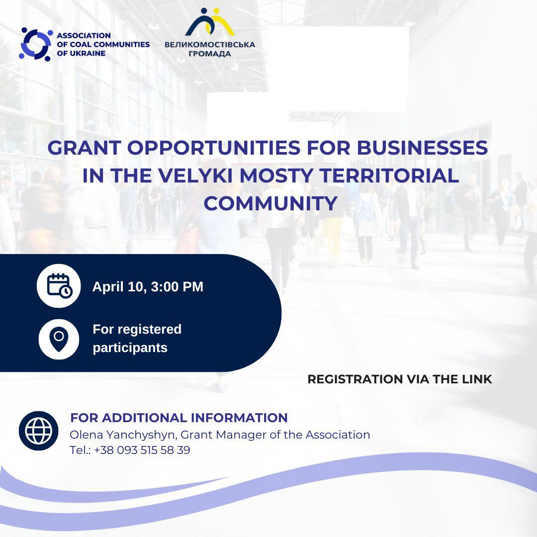 The Association of Coal Communities of Ukraine, in cooperation with the Velyki Mosty City Council, invites local entrepreneurs to participate in an event focused on securing grant funding.