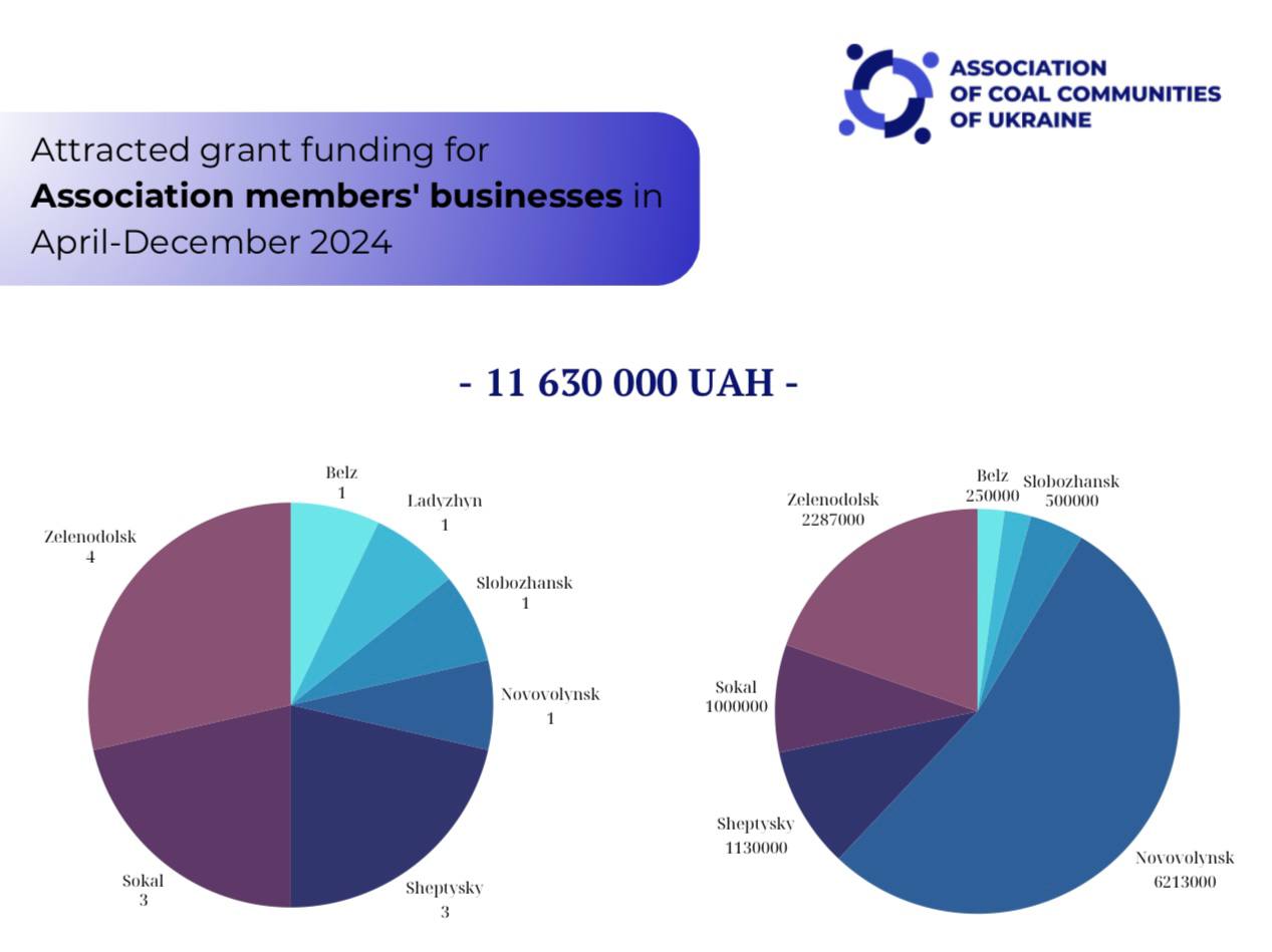 In 2024, the Association attracted grant funding for entrepreneurs in coal communities across Ukraine in the amount of UAH 11,630,000. This contributed to the implementation of promising business ideas, creation of 47 new job positions, opening of new enterprises, expansion and modernization of a large number of production facilities.