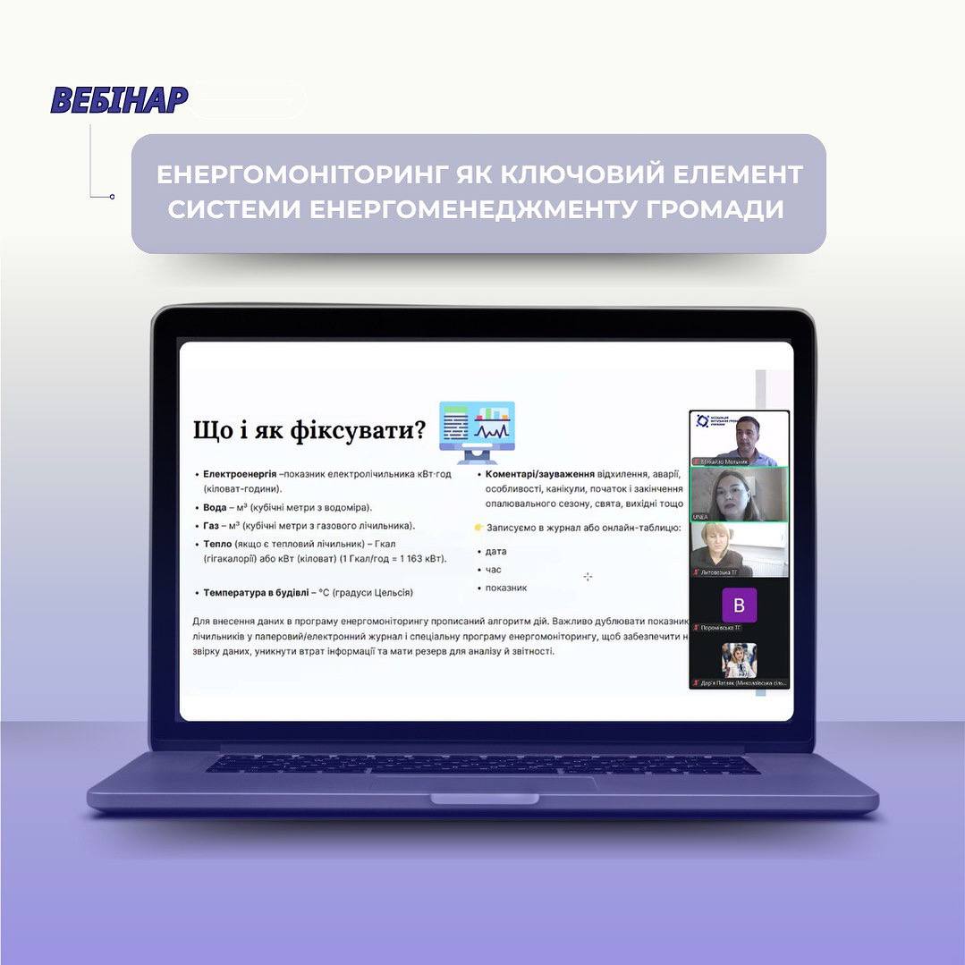 Під час вебінару говорили про те, як ефективно налагодити систему енергомоніторингу, відстежувати споживання енергії у школах, лікарнях та адмінбудівлях, а також як на основі зібраних даних ухвалювати рішення, що знижують витрати громади та підвищують ефективність управління.