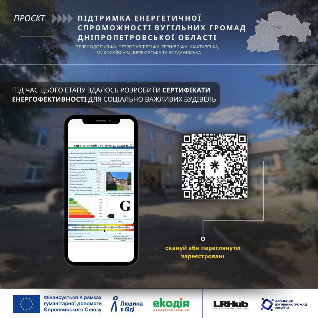 Після енергоаудитів соціально важливих будівель громади отримали перші енергетичні сертифікати. Це офіційні документи, зареєстровані у державній базі, які показують реальний стан будівель, клас їх енергоефективності та містять рекомендації щодо зменшення втрат енергії.